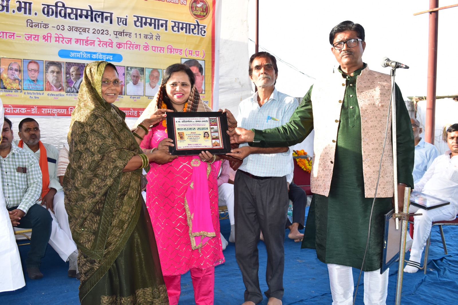 बाहर से आए हुए कवियों एडवोकेट वेदप्रकाश मणि अलीगढ़, राजकुमार भरत एटा, वीरेंद्र तिवारी उरई, डॉक्टर अंजना कुमार कानपुर, डॉक्टर शिवेद्र सिंह शिवेंद्र रौन, हरीबाबू शर्मा निराला मिहोना, किशोरीलाल बादल भिंड, आशुतोष शर्मा नंदू, इन्द्रबहादुर सिंह, श्रीकृष्ण शर्मा, धर्मेंद्र त्रिपाठी के द्वारा कवितापाठ किया गया। उपस्थित अथिति कवियों को शहर के प्रतिष्ठित नागरिकों द्वारा अपने पूर्वजों की स्मृति में सम्मानित किया गया। पूर्व नगरपालिका अध्यक्ष भिण्ड गोपाल मिश्रा स्मृति सम्मान सेवादल के जिलाध्यक्ष संदीप मिश्रा, श्री रामदयाल शर्मा श्री भुवनेश शर्मा स्मृति सम्मान डॉ. हरविलास शर्मा एवं उनके पुत्र आशुतोष शर्मा, श्री लाखन सिंह कुशवाह असनेहट स्मृति सम्मान आचार्य गजेंद्र सिंह कुशवाह, श्री रामशरण शास्त्री श्रीमती गिरिजा देवी स्मृति सम्मान सनत कुमार शर्मा राजेश कुमार शर्मा ने भेंट किया।